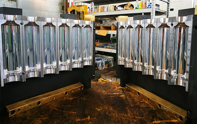 Delivered to an Italian Company a blow mould for an injection-stretch blow-moulding machine AOKI 350 (ISBM -one step) for the production of PET bottles for the pharmaceutical industry Mould features: Cavities: 14 Bottle volume: 10 cc. Mould used on AOKI 350 machine